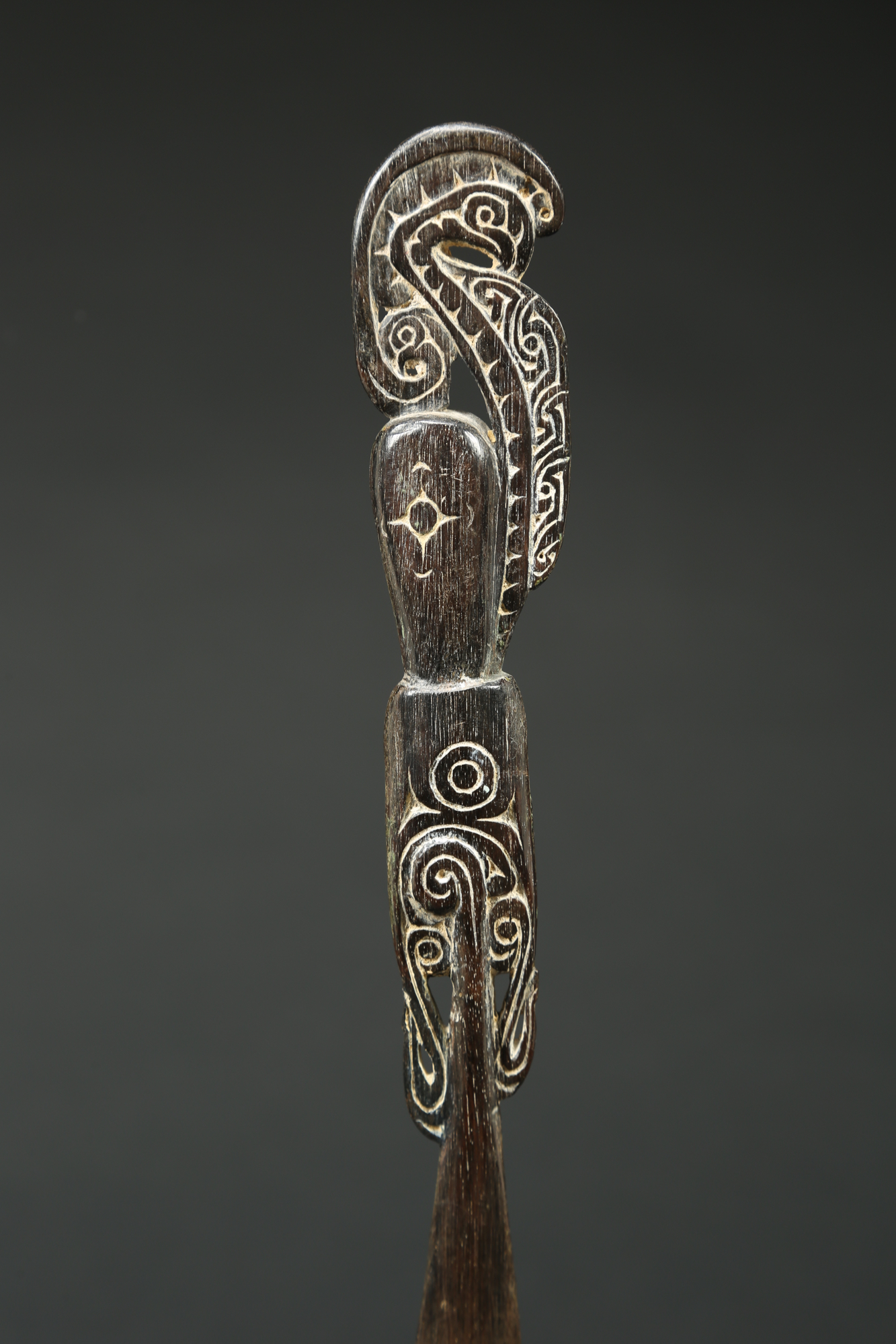 A classic Massim lime spatula with multiple bird images. The intricate carving is very finely done, and has white kaolin in the recesses. The overall piece has a good patina from age and use. There is an old collection number on the piece, but I do not know the collection that this comes from. Mounted on a custom metal base. Previously in the collection of Marc Feldman, Stanford, CA, Ex-Australian collection. 13" tall by 1 1/2" wide. Early 20th century, New Guinea. ....$950.00 |
