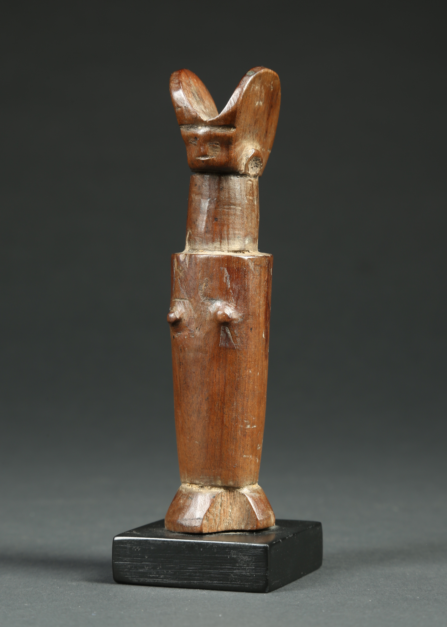 A finely carved small wood Zaramo doll with a small face and large hairdo. The patina is good from age and handling. Previously in the collection of Jaap Bongers, CA. 4 1/4" tall by 1" wide. Early 20th century, Tanzania, Africa. ....$375.00 |